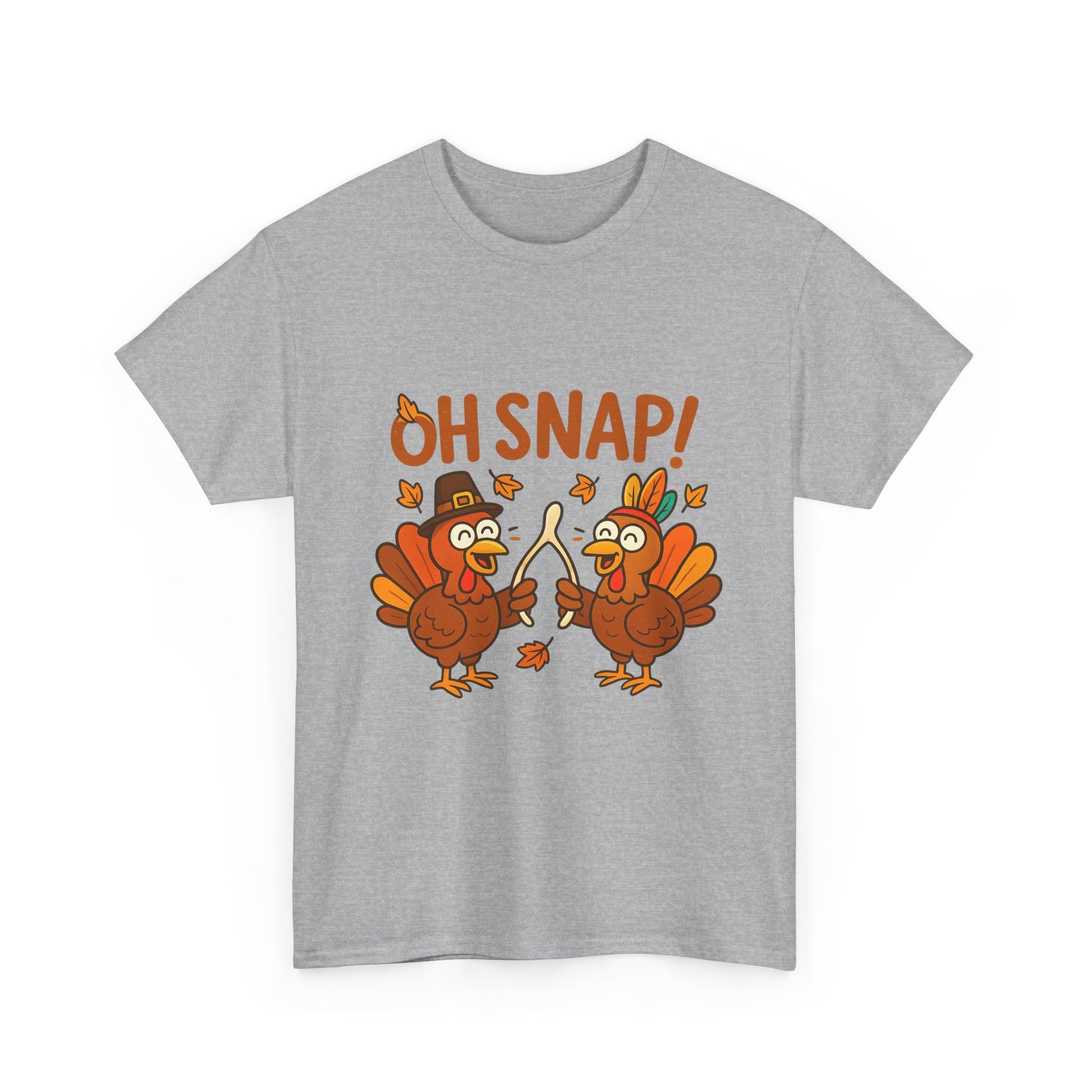 Festive and fun Oh Snap turkey Thanksgiving T-Shirt perfect for celebrating the holiday season. This unisex heavy cotton tee is made with specially spun fibers for a strong and smooth fabric, ideal for printing. Relevant to adults celebrating Thanksgiving.
