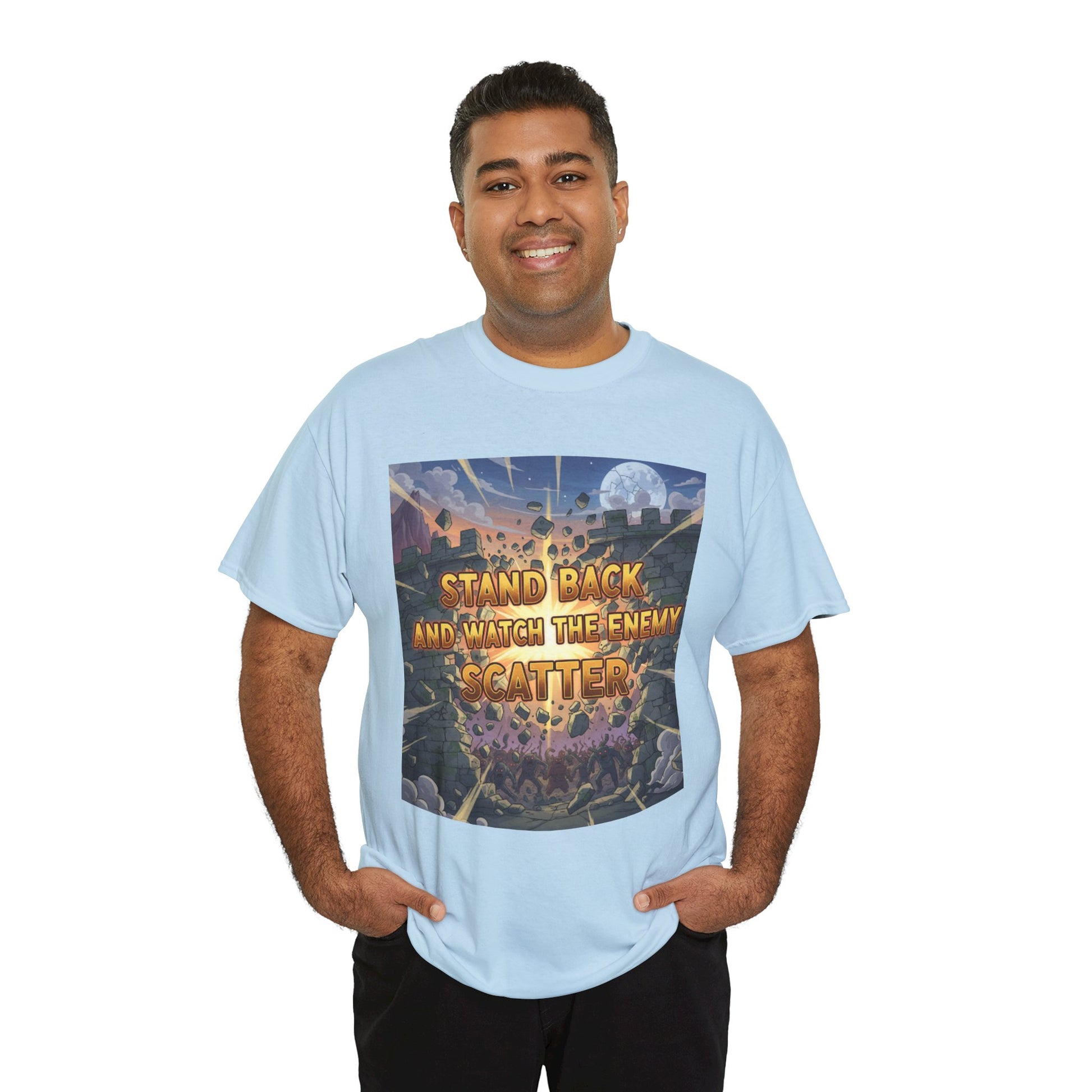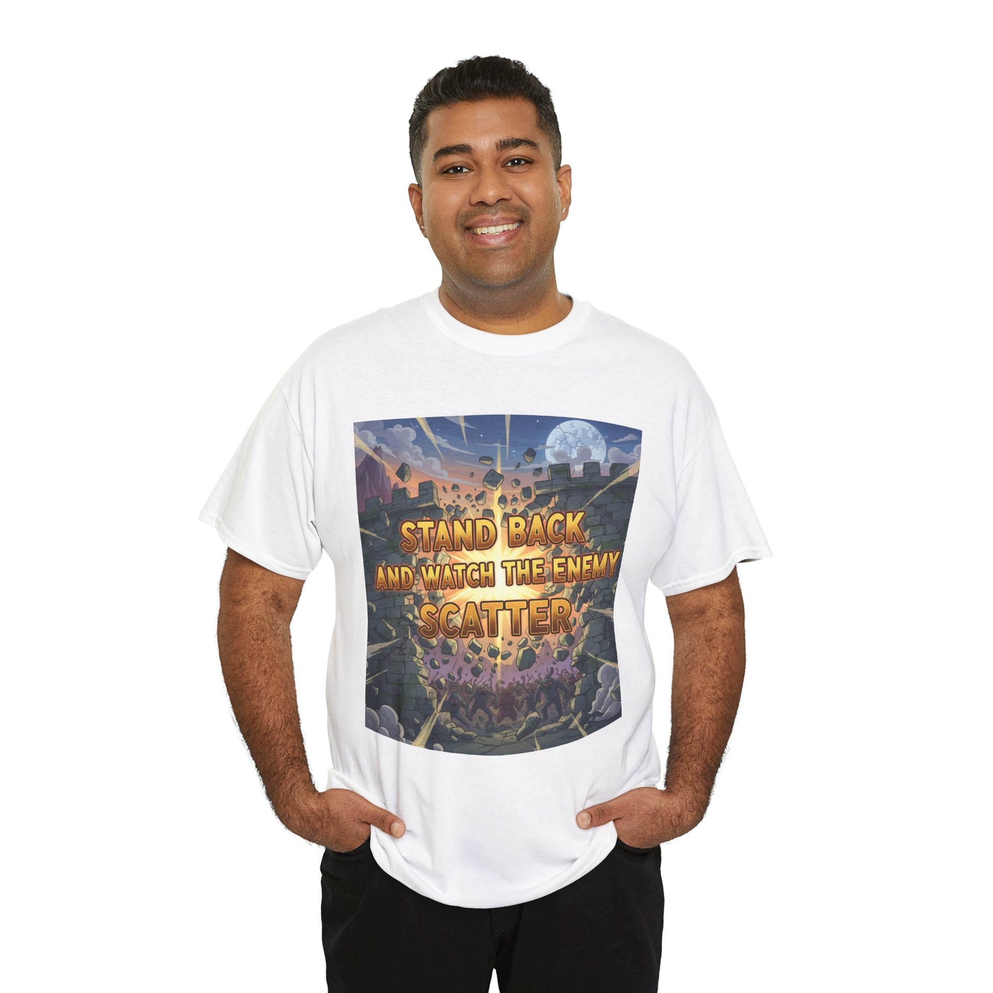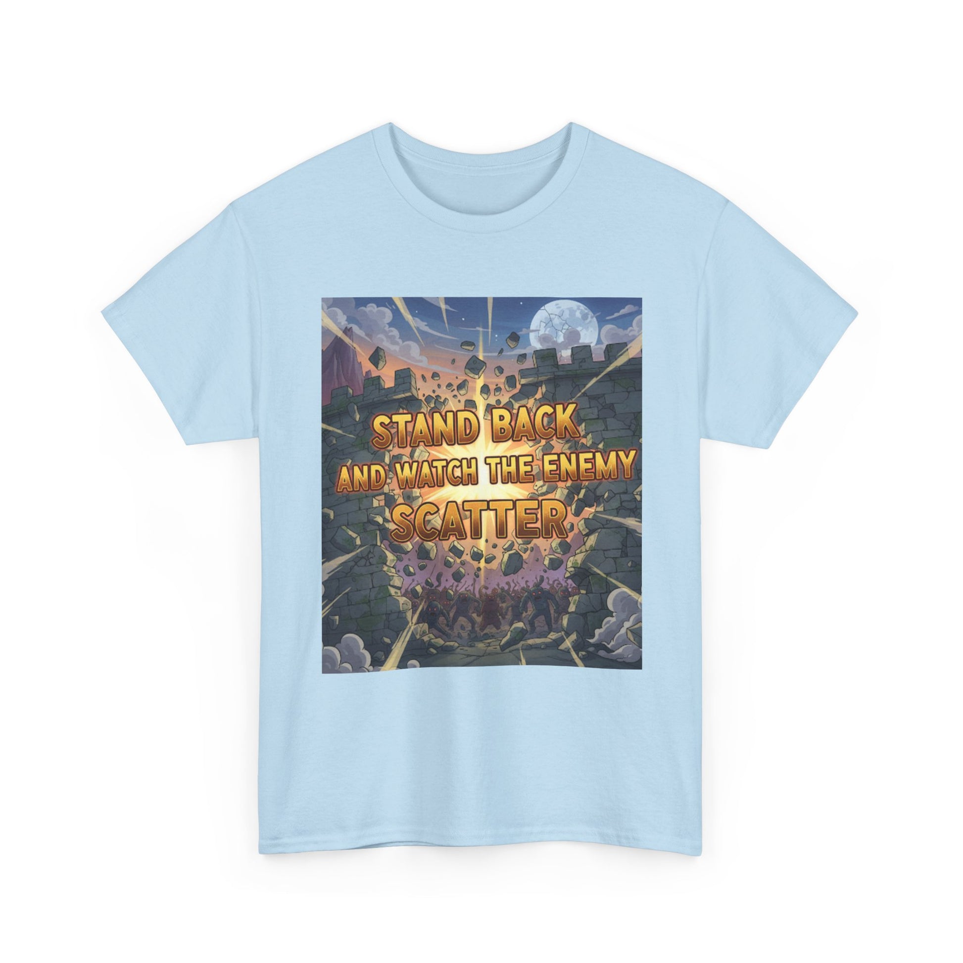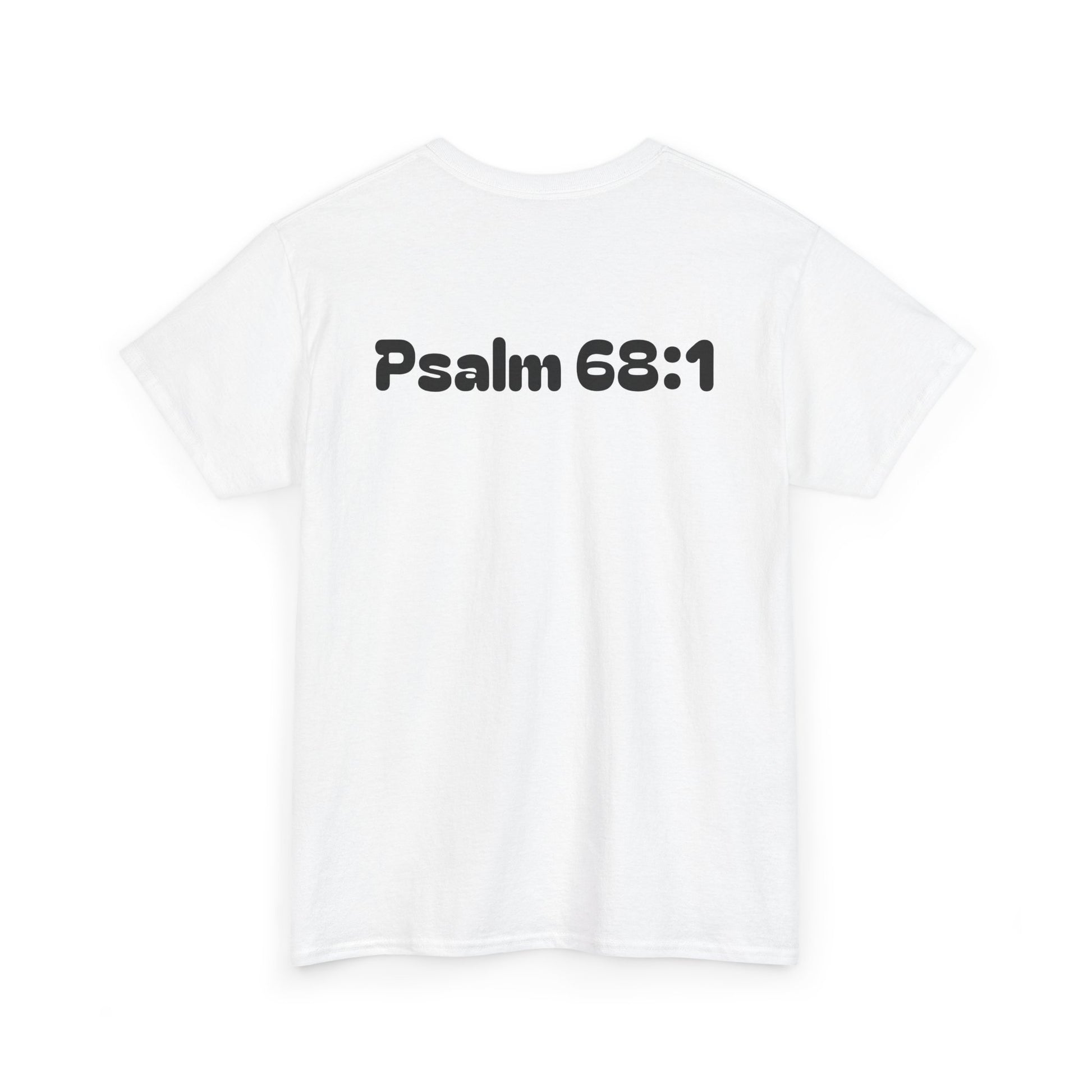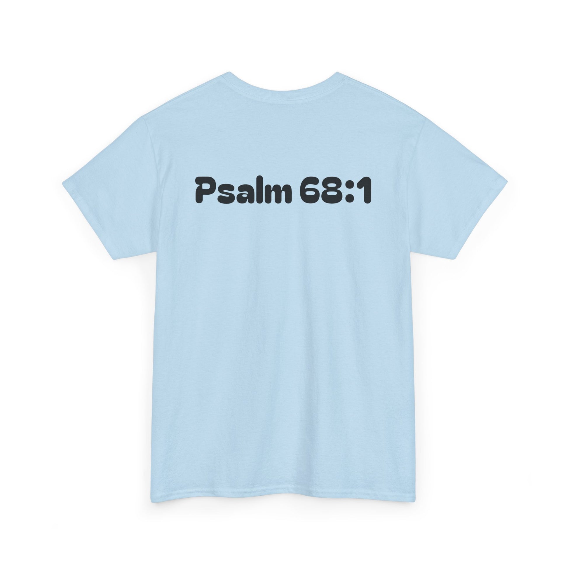 A soft, sturdy tee that wears like a trusted companion while carrying a bold, faith-forward message. The front shows a cinematic, illustrated battle scene lit by moonlight with the words “Stand back and watch the enemy scatter,” and the back bears a clean “Psalm 68:1” stamp—subtle testimony that starts conversations.